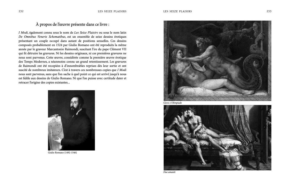 Deux époques se croisent dans ce récit: le XVIe siècle au cours duquel Giulio Romano, un élève de Raphaël, dessine seize dessins représentant un couple dans autant de positions et le XXe siècle avec le couple Ciano.